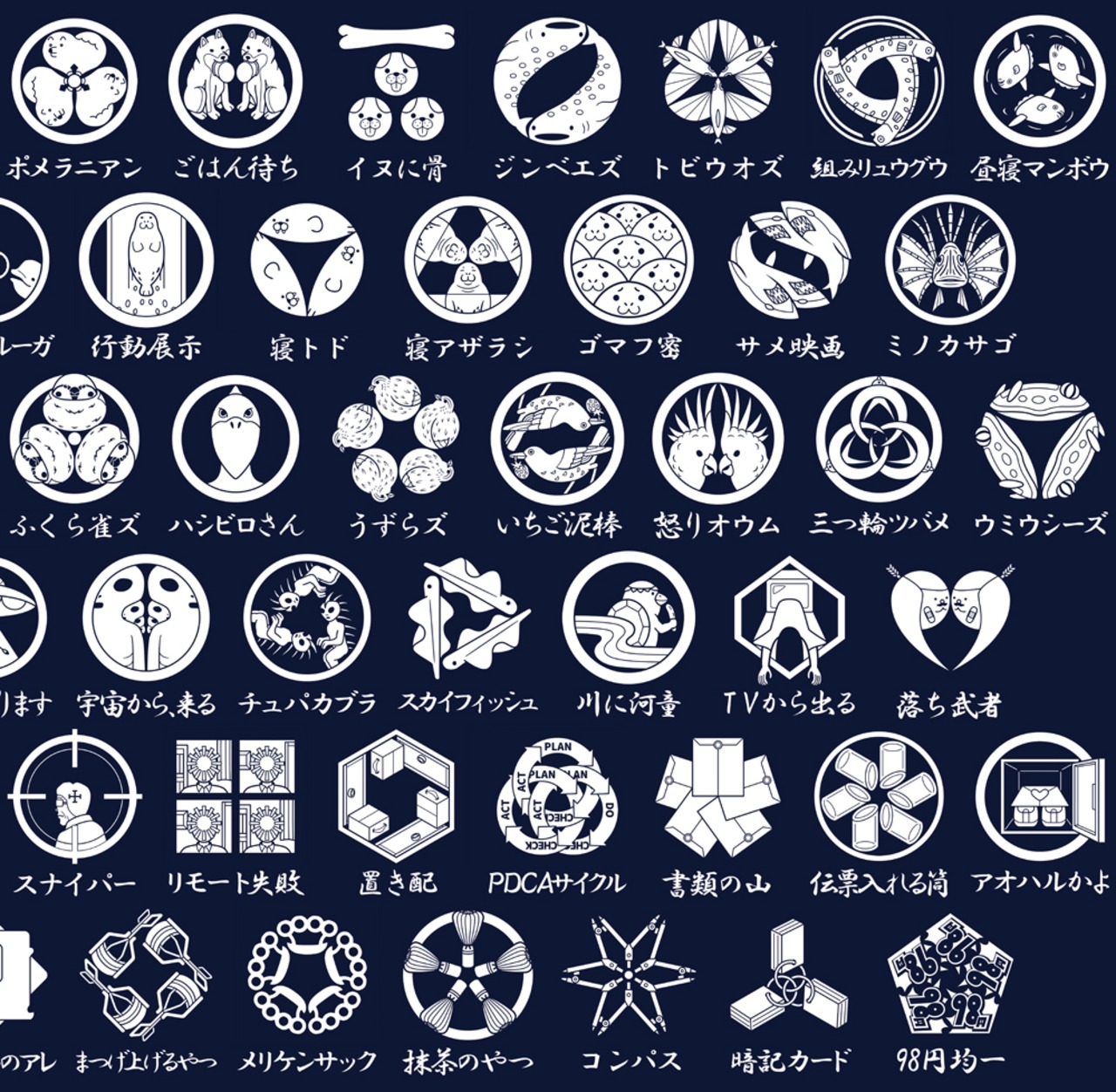 少し遠くから見ると本物の家紋に見え、近くで見ると何だか面白いデザインが100紋以上入っています